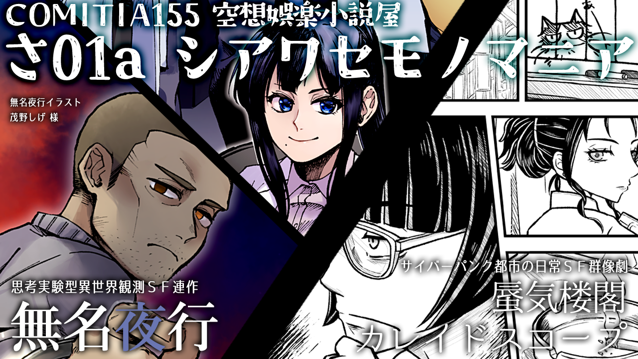 初売りとして異世界垣間見SF短編連作『無名夜行 04』、その他『無名夜行』シリーズ各種と、番外編的存在である『迷鳥回視』を持っていきます。