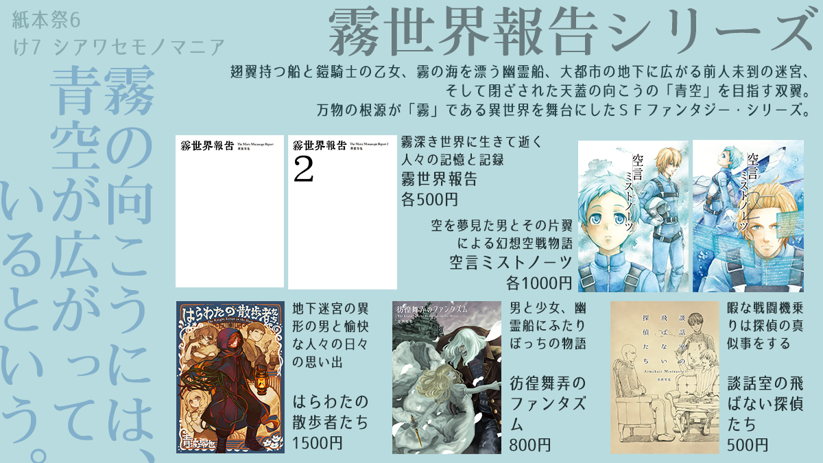 異世界観測SFシリーズ・『無名夜行』01~03、『無名夜行 三十夜話』、『無名夜行 三十一路』、『無名夜行 五人六葉』、『迷鳥回視』を持ち込みます。