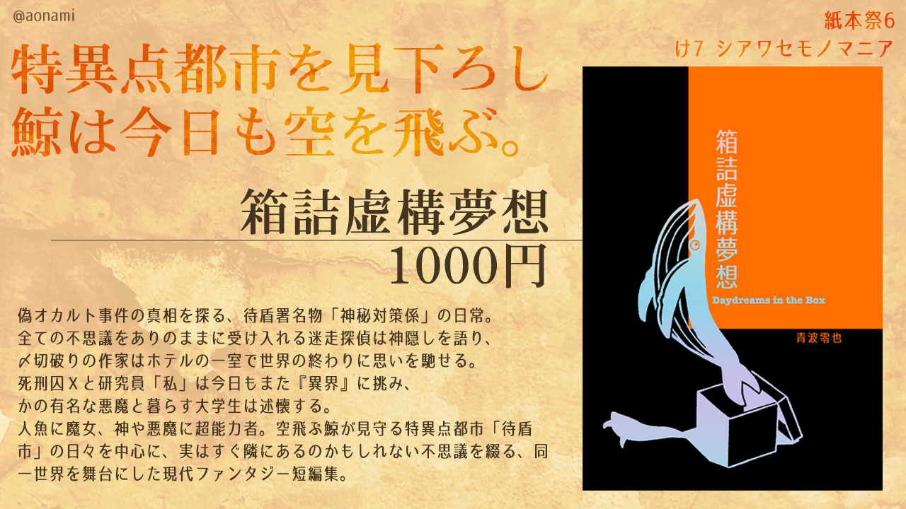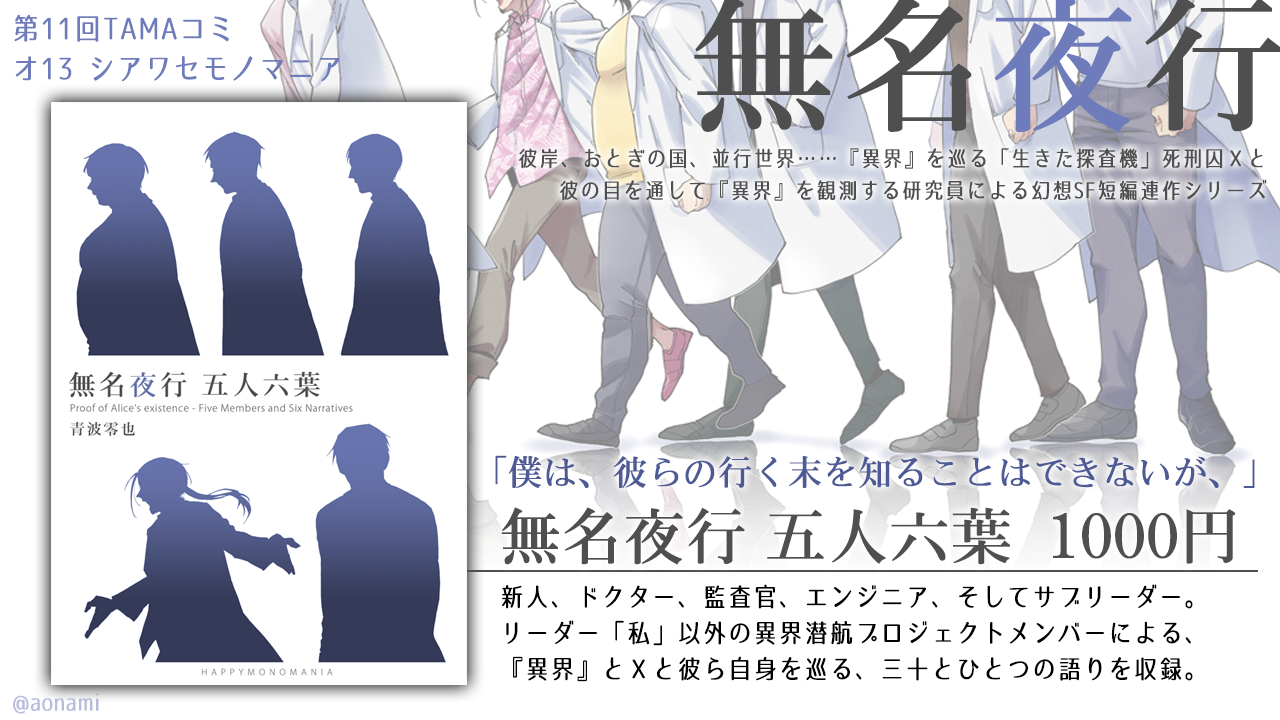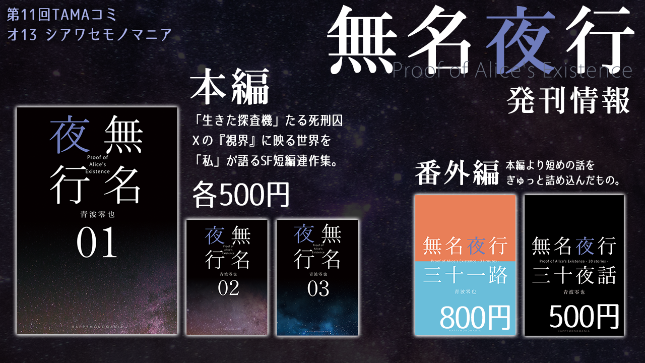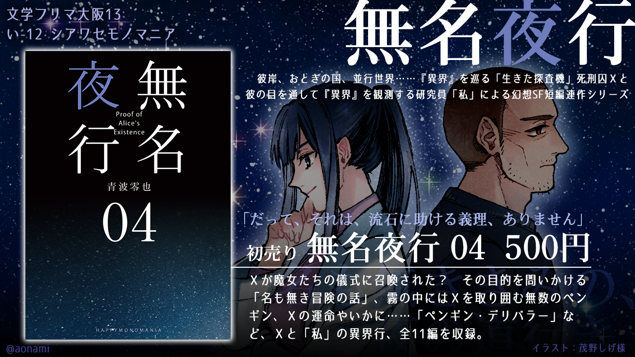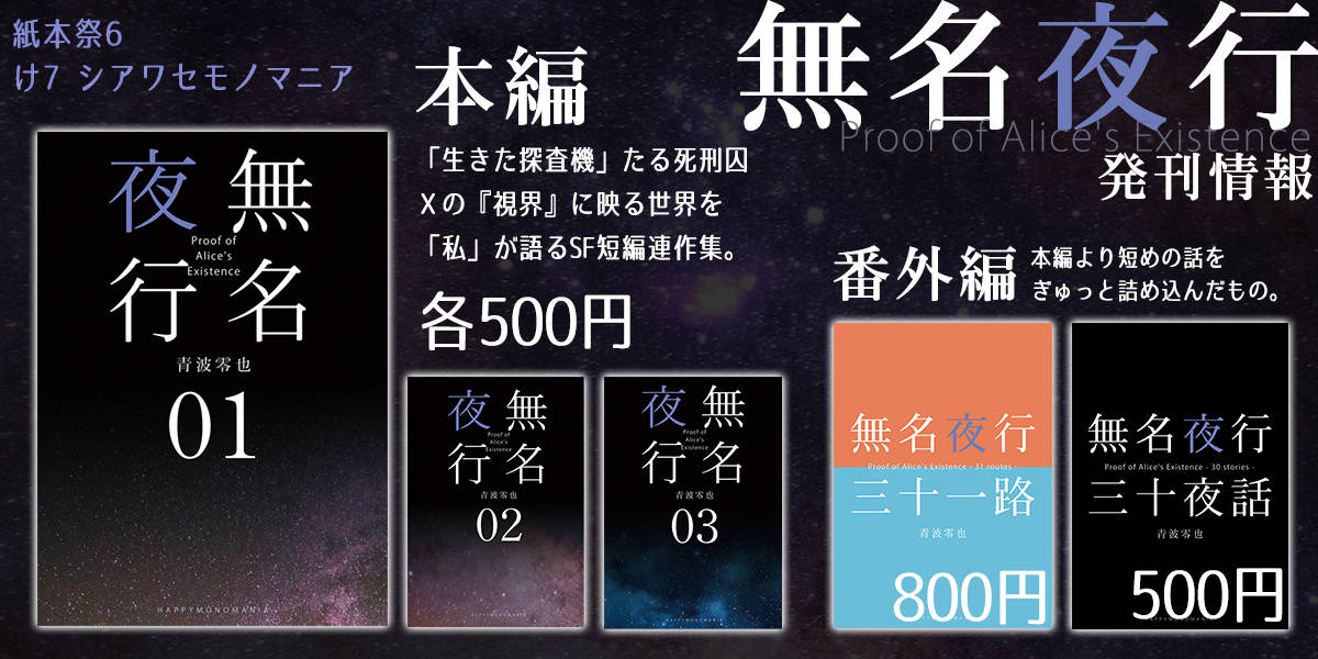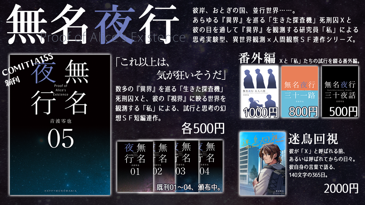 初売りとして異世界垣間見SF短編連作『無名夜行 04』、その他『無名夜行』シリーズ各種と、番外編的存在である『迷鳥回視』を持っていきます。