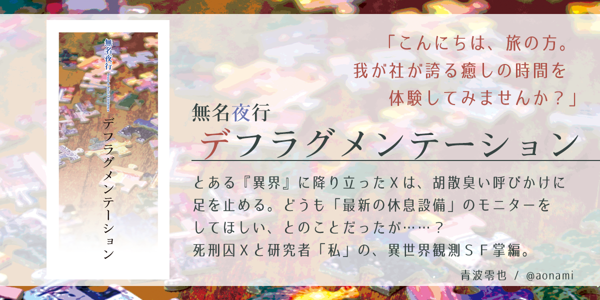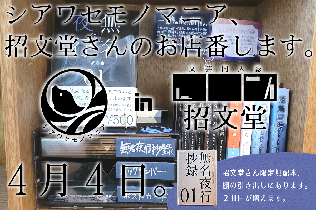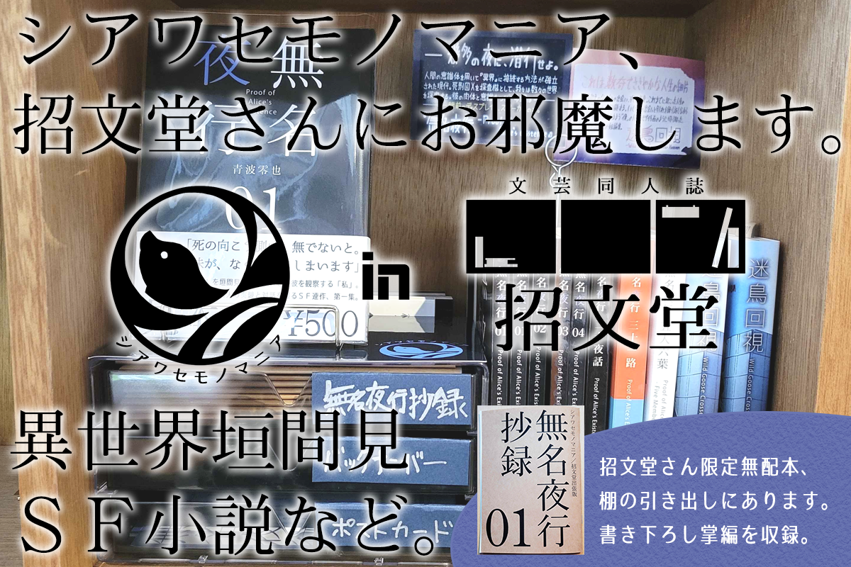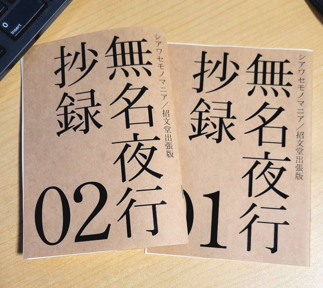 なお、招文堂さん向け無料配布本に収録したお話は最終的には『無名夜行』本編冊子に収める予定ですが、コピー本の形ではこれが最初で最後の発刊になりますので、この機会に是非とも!