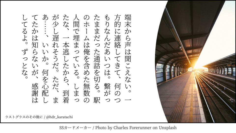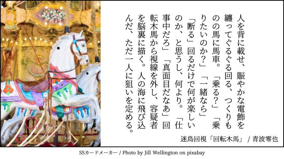 人を背に載せ、賑やかな電飾を纏ってぐるぐる回る、つくりものの馬に馬車。「乗る?」「乗りたいのか?」「一緒なら」「断る」回るだけで何が楽しいのか、と思うし、何より。「仕事中だろ」「真面目だなあ」回転木馬から視線を外し、容疑者を脳裏に描く。人の海に飛び込んだ、ただ一人に狙いを定める。