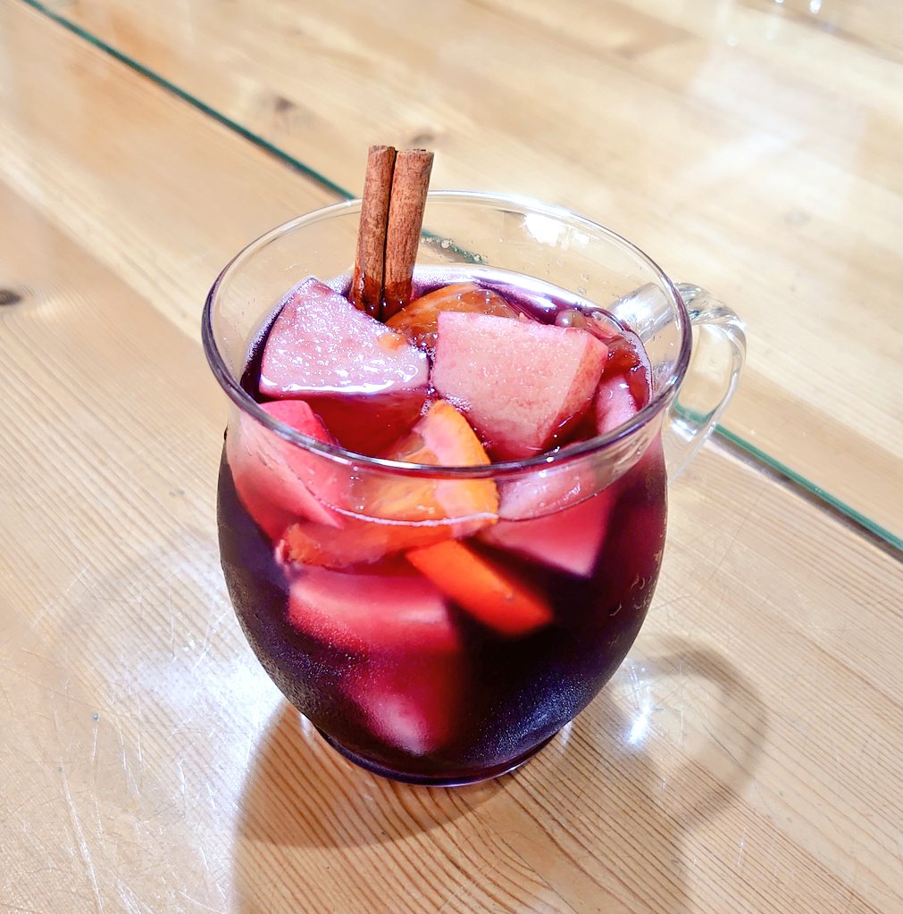 赤ワインにリンゴとオレンジとフルーツ缶とシナモンスティックとお砂糖を混ぜたもの。