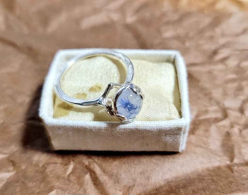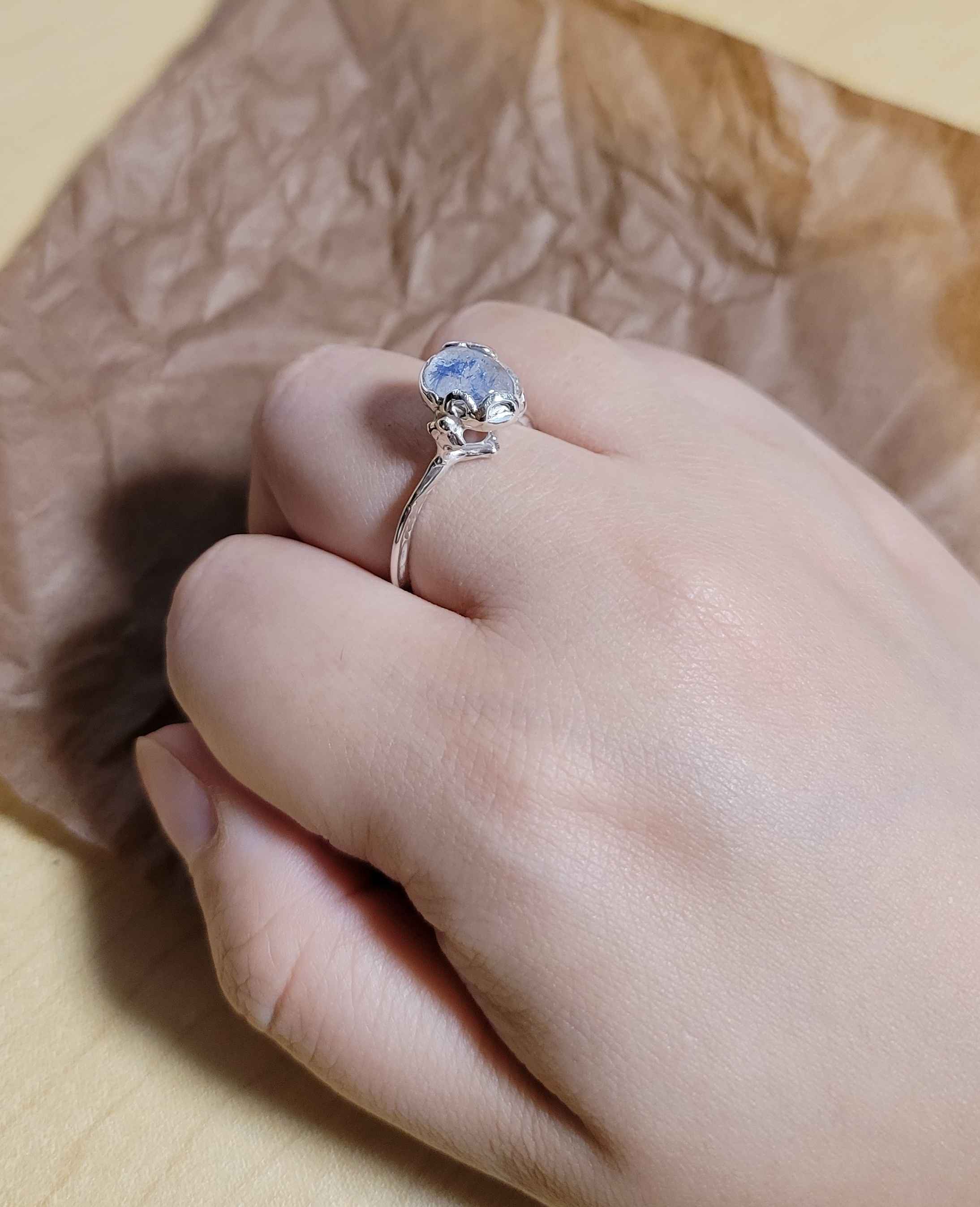 かすむような色の石の合間にのぞく青と、その中に浮かぶちっちゃなインクルージョンがとてもかわいい。