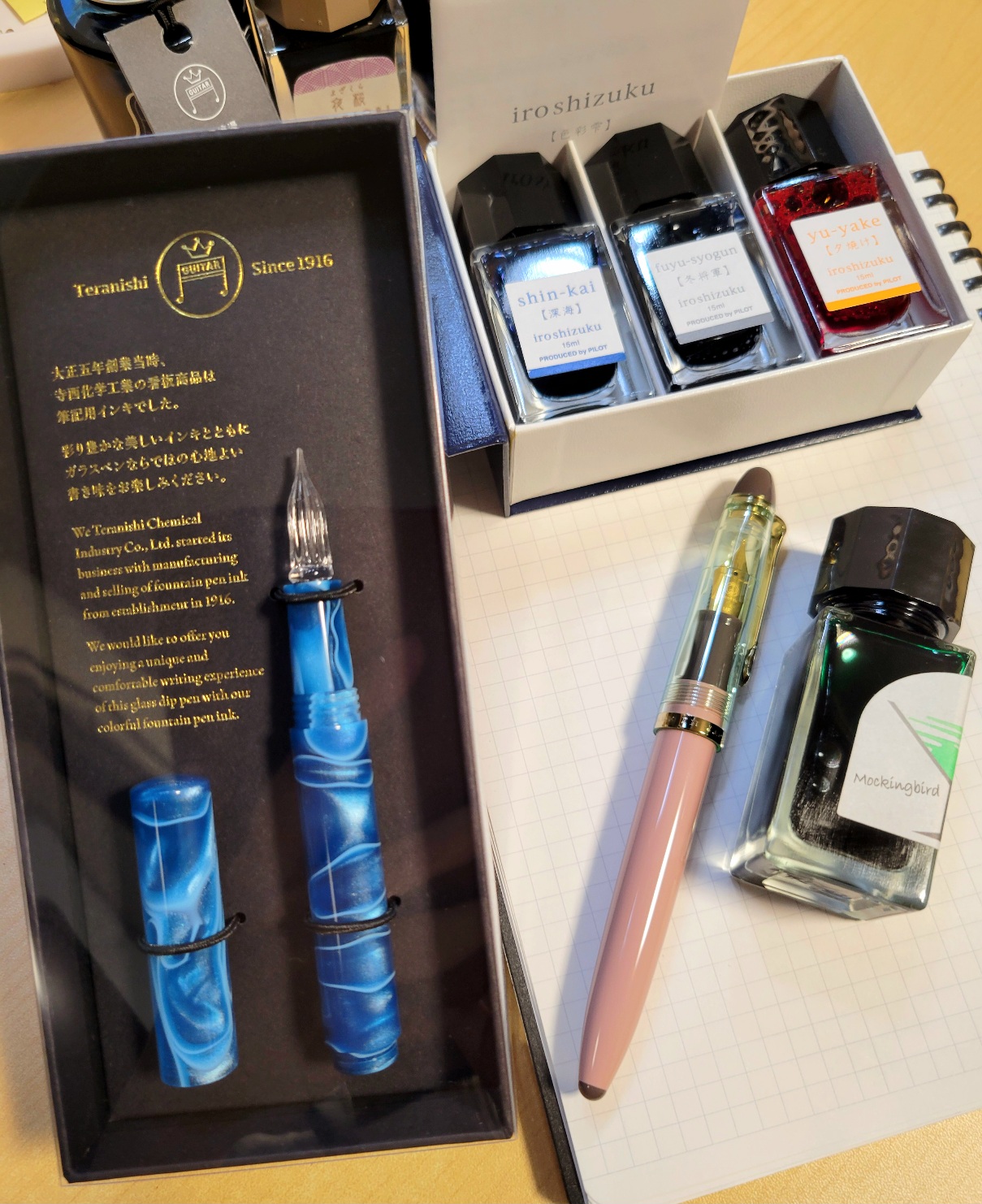 ずっと欲しかった寺西化学工業のギターガラスペン、あと色彩雫の深海・冬将軍・夕焼け。