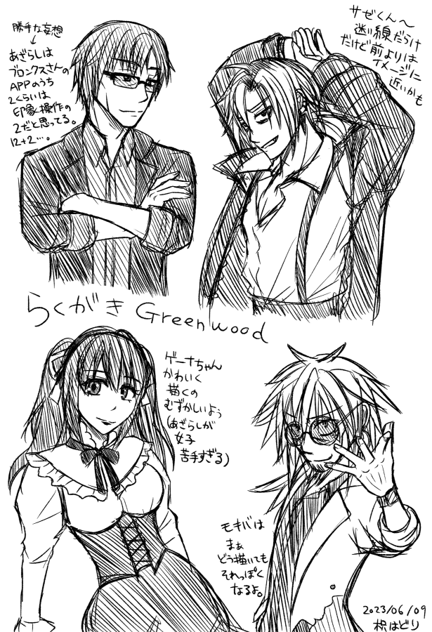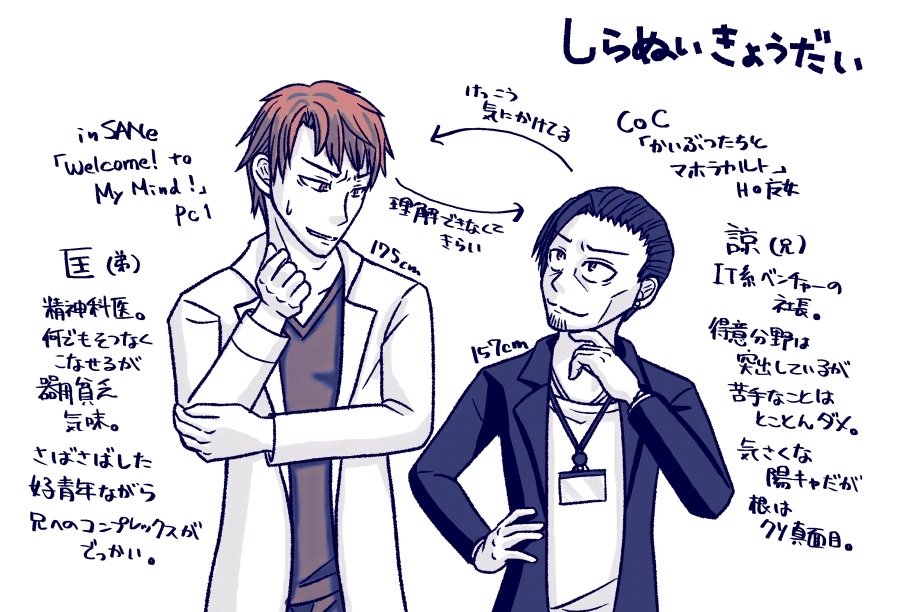 らくがき、不知火きょうだい(諒と匡) 続きを読む あざらしはよく似てるきょうだいも好きだけど、こういう「似てないけど何となく雰囲気に共通点がある」感じのきょうだいが狂おしく好き。 どっちも育ちはよさそうではあるんだよな……。 不知火、どっちも明るいインテリなんでその辺りの癖が出るといいな~とは思っている。 畳む #あざらしおえかき 2023.6.2(Fri) 05:46:34 らくがき edit