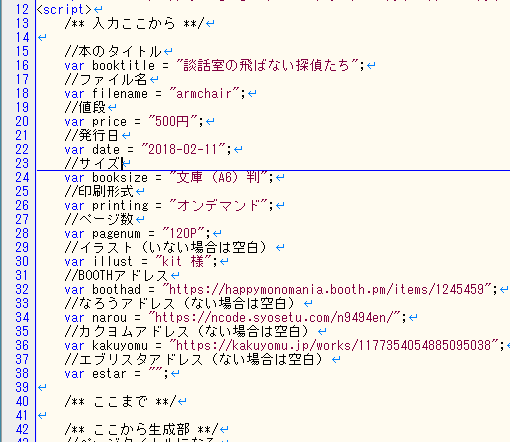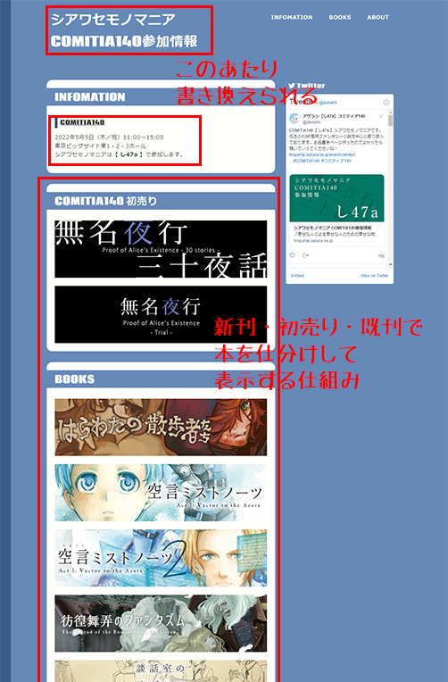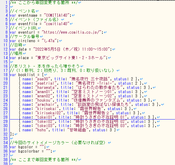 冒頭でイベント名とサークルナンバーと必要情報入力すれば自動的にその回の参加情報入れたページを作ってくれる……感じ……。